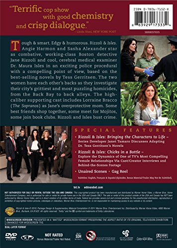 Tough & smart. Edgy & humorous. Rizzoli & Isles. Angie Harmon and Sasha Alexander star as combative, working-class Boston detective Jane Rizzoli and cool, cerebral medical examiner Dr. Maura Isles in an exciting police procedural with a compelling point of view, based on the bestselling novels by Tess Gerritsen. The two women have each other's backs as they investigate their city’s grittiest and most puzzling homicides, from the Back Bay to back alleys. The high-caliber supporting cast includes Lorraine Bracco (The Sopranos) as Jane’s overprotective mom. Some best friends shop together, some meet for Mojitos, some join book clubs. Rizzoli and Isles bust crime. Talk about grrrl power! Rizzoli & Isles features the best two-woman crime-solving duo since Cagney & Lacey--supported by terrific writing and outside-the-box cases. Angie Harmon has never been better, as the tough Boston detective Jane Rizzoli. Her partner in crime (solving) is the equally impressive Sasha Alexander as Dr. Maura Isles, the by-the-books medical examiner who always has Rizzoli's back, but is often appalled at the cop's hard-charging tough-Boston-girl approach. Rizzoli & Isles is based on the series of popular mysteries by Tess Gerritsen, and adapted faithfully and engagingly for TV viewers. One thing that sets Rizzoli & Isles apart from the average police procedural is its crisp direction and subtle writing; even the most die-hard cop-show viewer will be engaged and surprised by the plots' twists and turns. And then there's the acting. Harmon has harnessed her dramatic chops and uses them perfectly as Rizzoli, and Alexander is both ideal sidekick and sometime foil as she tries to steer Rizzoli to follow the rules. The key in any double-starring series is chemistry, and Harmon and Alexander have it in spades--their sparring and intellectual one-upmanship are completely believable. The cases in season one are varied, though focus mostly on serial killers, with one particularly gripping case flashing back to the notorious Boston Strangler case. The first season of Rizzoli & Isles features two great behind-the-scenes features, one with series creator Janet Tamaro on how she adapted the Gerritsen books, and another with the cast and crew about the making of the series. There's also a hilarious gag reel that shows just how much fun everyone is really having on the set. A must for crime-show buffs and fans of great actresses heading their own series. --A.T. Hurley